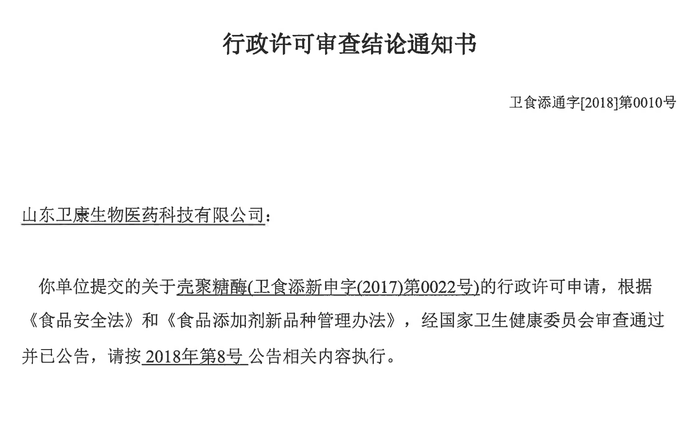2018年8月27日,提交的關于殼聚糖酶(衛食添新申字(2017)第0022號)的行政許可申請,經國家衛生健康委員會批準,成為食品工業用酶制劑新品種。