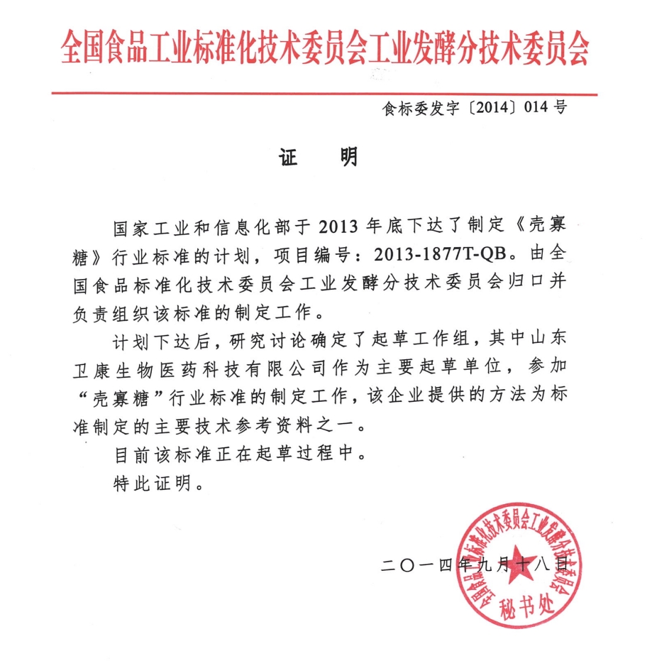 2014年4月16日,組織申報的殼寡糖原料,通過了國家食品安全性審查和評估,被國家批準為新資源食品原料。