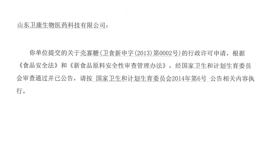 2014年12月22日,獲得了殼寡糖食品生產許可證,這是國家頒發的首家殼寡糖食品生產許可證。